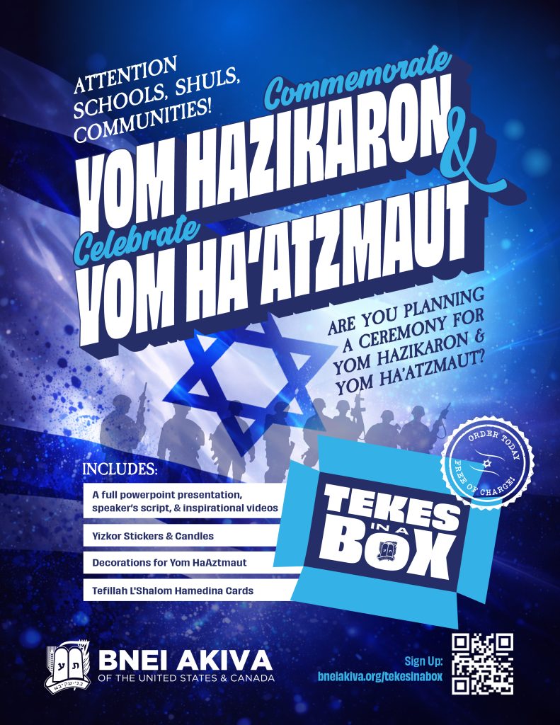 Tekes in a Box is a comprehensive package designed to help schools, shuls, and communities commemorate Yom HaZikaron and celebrate Yom HaAtzmaut with ease. It includes all the essential resources needed to create a meaningful and engaging event.